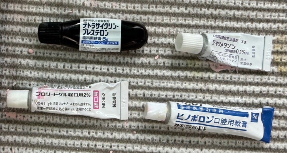 上記の画像以外にも、歯科で使う軟膏はいくつもありますが、今回は使用頻度も高いであろう画像に示している4つについて書きます。
