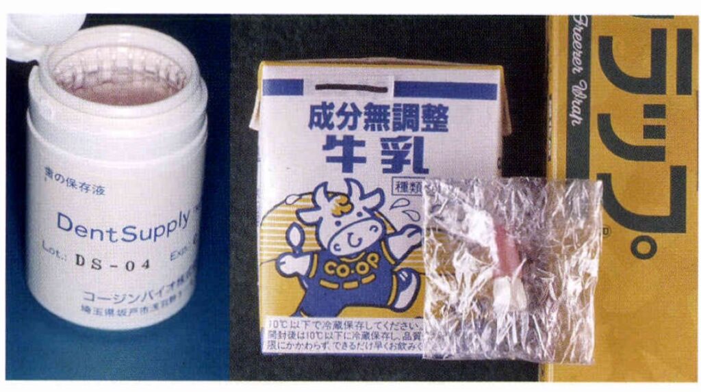 2つ目は、牛乳です。非常に意外ですが、牛乳は、歯に近いpHを持っているため、乾燥を防ぎつつ、歯根膜にダメージを与え時に済むのです。